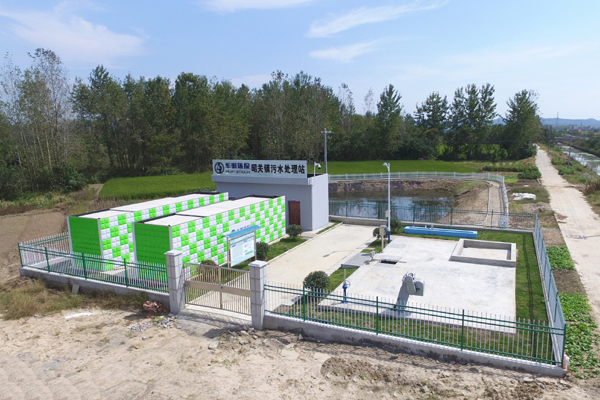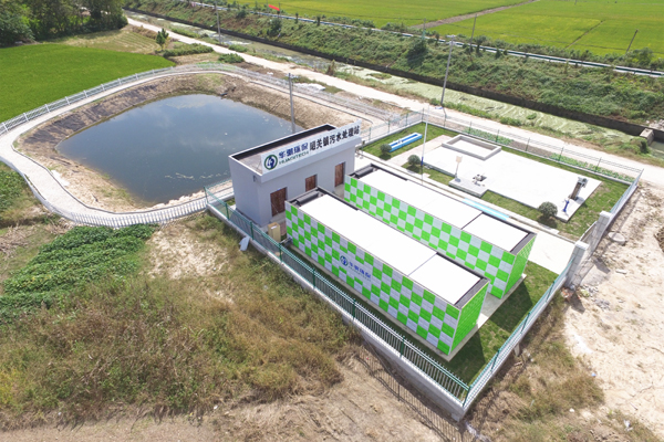 /d,远期(2030年)规模为500m³/d,工程总用地面积1.10亩。其中近期工程占地0.90亩,远期预留0.20亩;生态塘总用地面积约为1.8亩。工程主体工艺设备采用“魔方舟”一体化污水处理设备,主工艺设施土建按近期建设,而配套工辅设施土建按远期建设,设备按近期购置;生态塘按近期规模建设。尾水排放至民兵渠。