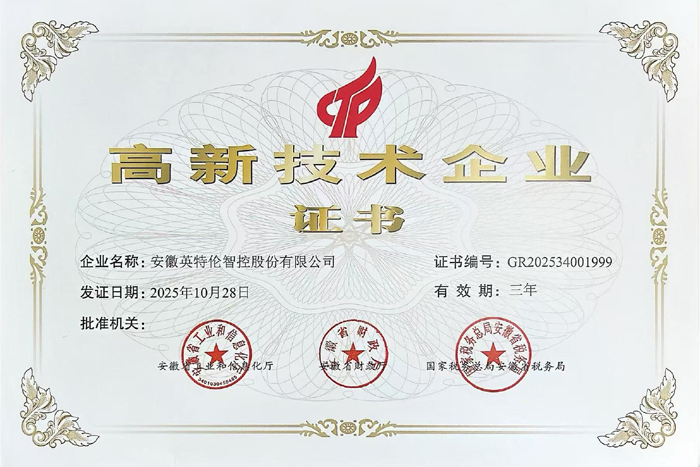 旗下子公司安徽英特伦智控股份有限公司正式通过国家高新技术企业认定。该认定标志着英特伦智控在核心技术自主创新、科技成果转化及成长性等方面获得国家认可,将进一步促进其研发投入与技术升级,提升市场竞争力。