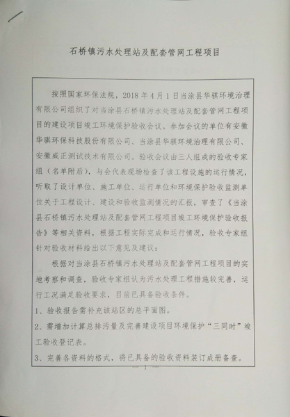 、当涂县焦点娱乐环境治理有限公司、安徽威正测试技术有限公司。验收会议由三人组成的验收专家组(名单附后),与会代表现场检查了该工程设施的运行情况,听取了设计单位、施工单位、运行单位和环境保护验收监测单位关于工程设计、建设和验收监测情况的汇报,审查了《当涂县石桥镇污水处理站及配套管网工程项目竣工环境保护验收报告》等相关资料,根据工程实际完成和运行情况,验收专家组针对验收材料给出以下意见及建议: