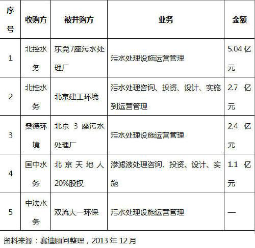 随着一系列促进污水处理行业发展的政策密集出台,对污水处理行业的乐观预期吸引了大量投资机构跨行业、跨领域进入污水处理领域。在上市公司中,湘鄂情收购江苏中昱环保科技有限公司51%股权,后者是一家包含水处理业务和废气处理业务的综合环保公司,资本市场给予其两个涨停板的反应;香梨股份100%收购新疆昌源水务,复盘收获三个涨停板。在污水处理行业内部,2013年也掀起了一轮并购热潮。北控水务、桑德环境等大型水处理企业全力出击,并购多家企业。