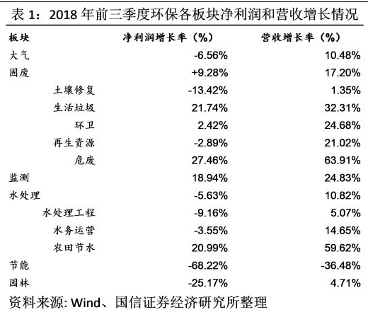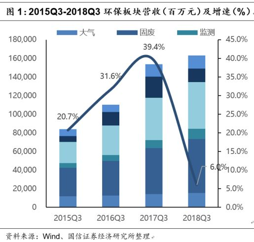 分析环保生态行业中大气、固废、水务、监测、节能和园林六大板块的65家公司的2018年三季报情况。同时根据板块内部公司的具体业务,将固废、水务两大板块进一步拆分,将固废板块分为生活垃圾、危废、环卫、土壤修复、再生资源5个细分子板块,将水务板块分为水处理工程、水务运营2个细分子版块,从各项指标详细分析了环保行业整体的发展情况。