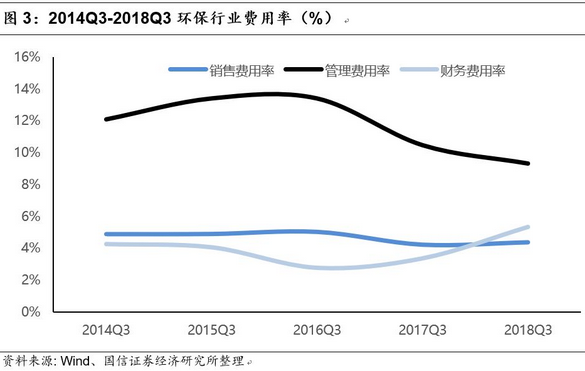 前三季度环保板块总体的财务费用率为5.33%,同比提高了1.97pct,增幅明显,而管理费用率和销售费用率两项指标均有所下滑,表明环保企业前三季承担着巨大的资金成本上行压力,同时尽可能地压缩内部成本,降低销售和管理费用,以期熬过寒冬。