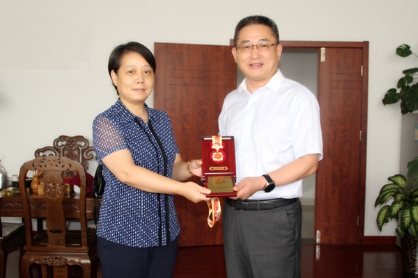 郑俊从马鞍山科技局局长王焰(左)手中接过纪念章