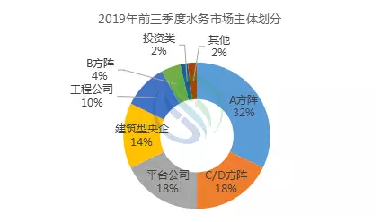 从水务市场主体份额的占比看,水务市场主体正在发生悄然变化,A方阵、C/D方阵、平台公司、建筑型央企、工程公司所拿项目数量占比整个水务市场总数量的92%,并形成了五雄割据的局面。值得一提的是,今年以来,平台公司和建筑型央企在水务市场的表现抢眼,会对水务市场原有的格局造成一定的冲击。