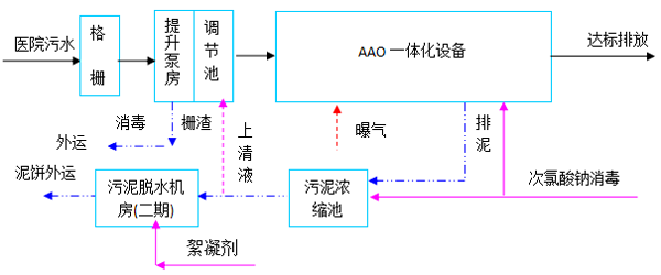 马鞍山市秀山新区综合医院将建成集医疗、科研、教学、预防、保健、急救为一体的三级现代化综合医院。医院污水主要为医疗及病房区污水,设计建设总规模为Q=1200 m³/d,分为两期,一期配套设备规模Q=600 m³/d,处理工艺采用:AAO+沉淀+消毒,污水处理站24小时运行,全自动控制。经污水处理站经处理,符合《医疗机构水污染排放标准》(GB18466-2005)中预处理标准后排入市政污水收集管网,经东部污水处理厂处理达标后外排。