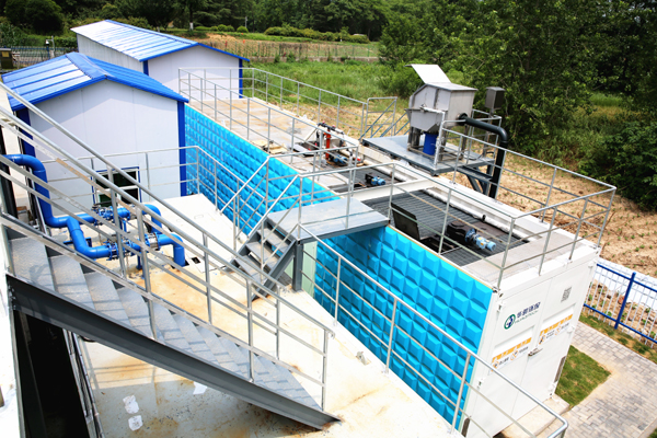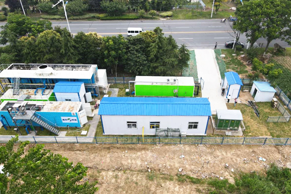 泗阳县经开区泗塘河文成路水质净化站,位于文成东路与泗塘河交口东北角,泗阳仁慈医院以东,实际占地约837.2㎡,设计处理能力2000m³/d,采用磁混凝系统+曝气生物滤池系统的主体工艺处理截流污水。站区内的进水接自河道旁的原提升泵站,出水通过观察井流入泗塘河。