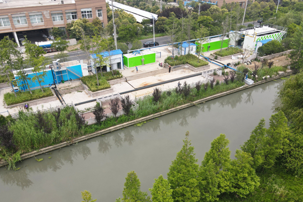 泗阳县经开区葛东河文成路水质净化站,位于文成东路与葛东河路交口东南角,秀达玩具厂以东,实际占地约704.2㎡,设计处理能力2500m³/d,采用磁混凝系统+曝气生物滤池系统的主体工艺处理截流污水。站区内的进水接自河道旁的污水井,出水通过清水渠流入葛东河。