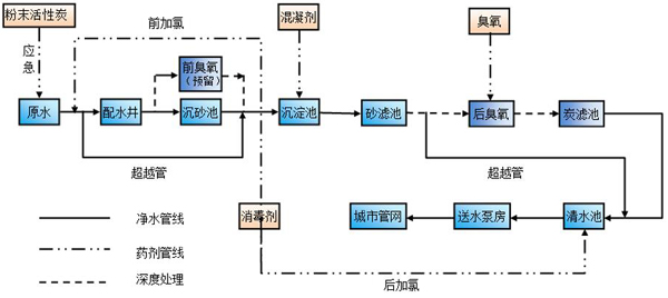 一期工程常规水处理工艺采用斜管自然预沉、高密度沉淀池、V型滤池、消毒的净水过程,以去除浊度、色度、细菌和病毒,本项目净水工艺流程如下图:
