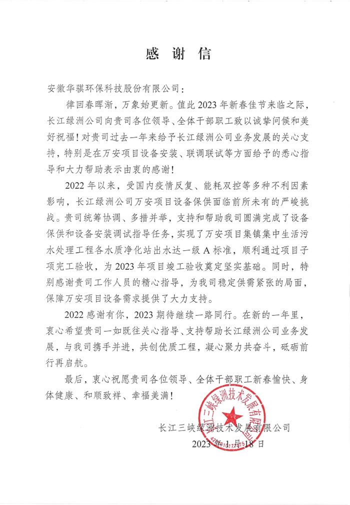 感谢信写道:“2022 年以来,受国内疫情反复、能耗双控等多种不利因素影响,长江绿洲公司万安项目设备保供面临前所未有的严峻挑战。焦点娱乐环保统筹协调、多措并举,支持和帮助我司圆满完成了设备保供和设备安装调试指导任务,实现了万安项目集镇集中生活污水处理工程各水质净化站出水达一级 A 标准,顺利通过项目子项完工验收,为 2023 年项目竣工验收奠定坚实基础。同时,特别感谢贵司工作人员的精心指导,为我司稳定供需紧张的局面保障万安项目设备需求提供了大力支持。”