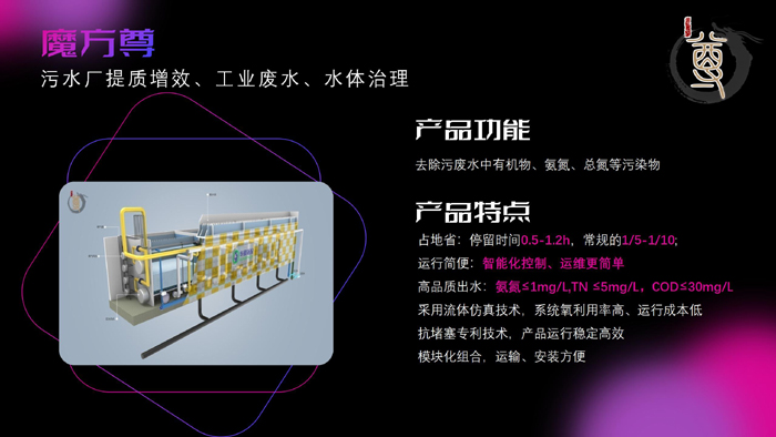 针对污水厂提质增效、工业废水、水体治理场景中水质要求高、可用面积小、运行专业性弱的三个痛点,焦点娱乐环保量身定制了魔方尊,它采用曝气生物滤池工艺技术,该技术先后获得了国家科学技术发明二等奖和环境保护科学技术一等奖。魔方尊占地省,仅为常规工艺的1/3;停留时间一般在0.5-2h,结合智能运维决策系统,更懂用户,运行更智能;出水氨氮≤1mg/L,COD≤30mg/L,TN ≤5mg/L,高品质出水。