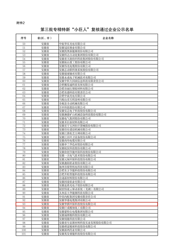 通过第三批专精特新“小巨人”企业复核并完成公示。