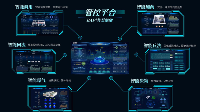 BAF智慧滤池拥有智能调用、智能回流、智能反洗、智能加药、智能曝气、智能决策六大板块,六驾“马车”齐发力,充分发挥AI 人工智能在水厂运营中的有力作用。智能调用系统自动计算滤池运行数量,根据用户需求交替启用,确保冬季低温下出水水质稳定达标,同时降低曝气能耗;智能回流系统实时调控回流比,解决了硝化液回流过量的问题,确保滤池精准脱氮,大幅节省电耗;针对不同功能的滤池,智能反洗系统通过选用循环洗、降水位反冲洗、强制反洗等模式,提高反洗效率,降低反洗频次,节省电耗;智能加药系统结合进水水质水量,AI智能投加反硝化碳源,确保总氮达标的前提下大幅度降低药耗;智能曝气系统充分考虑气泡经滤料剪切带来溶解氧升高的影响,实现按需供氧,降低曝气能耗;智能决策系统根据运营需求,对不同控制模块的经济性、安全性、稳定性进行综合比选,制定精准、有效的控制方案。