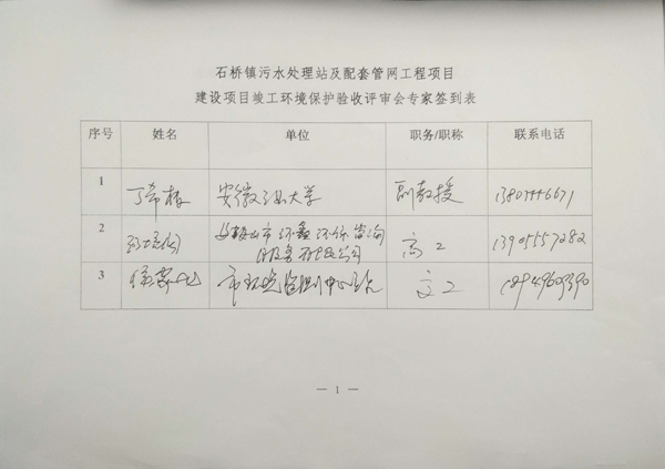 、当涂县焦点娱乐环境治理有限公司、安徽威正测试技术有限公司。验收会议由三人组成的验收专家组(名单附后),与会代表现场检查了该工程设施的运行情况,听取了设计单位、施工单位、运行单位和环境保护验收监测单位关于工程设计、建设和验收监测情况的汇报,审查了《当涂县石桥镇污水处理站及配套管网工程项目竣工环境保护验收报告》等相关资料,根据工程实际完成和运行情况,验收专家组针对验收材料给出以下意见及建议: