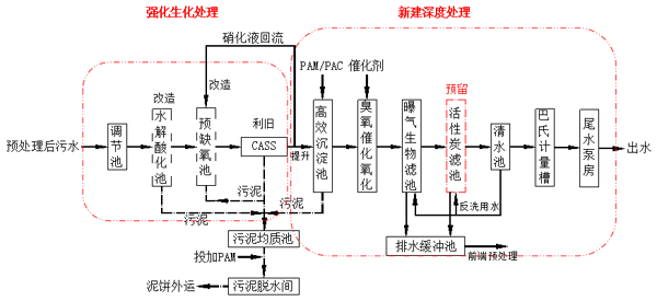 我司于2018年6月与国星生化公司签订该污水厂提标改造工程设计采购施工合同,2019年8月完成水质调试验收工作。改造后处理工艺采用:水解酸化(改造)+CASS工艺(改造)+高效沉淀池(新建)+臭氧催化氧化(新建)+曝气生物滤池工艺(新建),出水为《城镇污水处理厂污染物排放标准》(GB18918-2002)一级A标准,其出水利用现状污水管道进入当涂县第二污水处理厂。