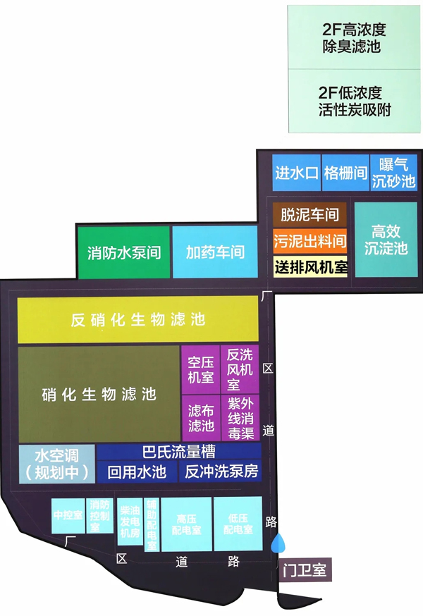 污水厂加盖封闭除臭,焦点娱乐环保采用了高、低浓度两套除臭系统,高浓度臭气采用生物滤池除臭,低浓度臭气采用活性炭吸附除臭,尾气通过综合大楼专用排放管道100m高空排放,有效解决了臭气对周边居民的影响,卫生防护距离缩小至零。
