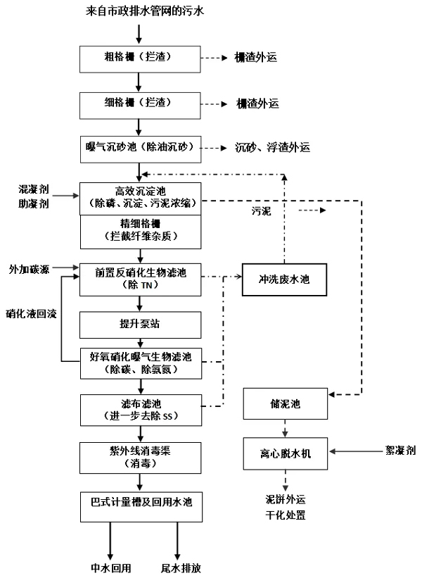 来自市政排水管网的污水先自流进入粗格栅、细格栅,去除污水中较大杂质,然后进入曝气沉砂池内进一步除油沉砂。经过预处理后的污水再进入高效沉淀池,去除污水中的总磷和部分有机物。高效沉淀池出水经过精细格栅进一步拦截纤维杂质后进入前置反硝化生物滤池去除总氮,出水经中间提升泵房提升至好氧硝化曝气生物滤池,进一步去除氨氮和有机物。曝气生物滤池出水进入滤布滤池进一步去除悬浮物,再进入紫外消毒渠进行消毒处理,最后通过巴氏计量槽计量后尾水排放或中水回用。