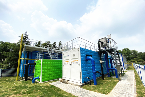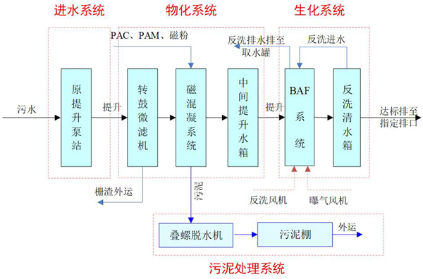 泗阳县经开区泗塘河文成路水质净化站,位于文成东路与泗塘河交口东北角,泗阳仁慈医院以东,实际占地约837.2㎡,设计处理能力2000m³/d,采用磁混凝系统+曝气生物滤池系统的主体工艺处理截流污水。站区内的进水接自河道旁的原提升泵站,出水通过观察井流入泗塘河。