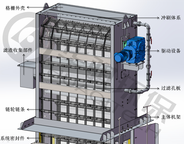 SupFTM产品结构:主要由驱动设备、主体机架、外壳、链轮链条、过滤孔板、冲刷体系、系统密封件、滤渣收集部件、及电气控制柜等部件构成。