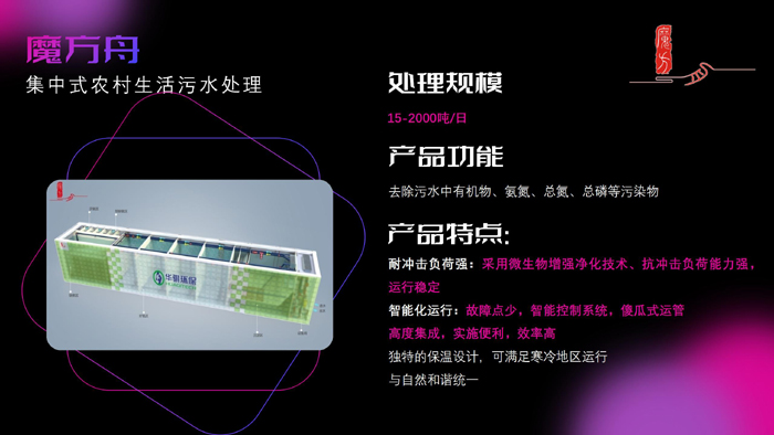针对以村镇污水处理为代表的小型生活污水处理设施应用场景,魔方智水的魔方舟是非常理想的选择。魔方舟采用A³/O泥膜耦合脱氮除磷技术,该项技术泥膜耦合,微生物量大,是常规工艺的1.5-2倍,同时活性高,解决了农村污水冲击负荷大运行不稳定的痛点;智慧化控制,系统可以根据不同的使用工况傻瓜式切换运行工况,避免了大量专业的参数调整和运行管理,解决了农村专业化水平不高的痛点;系统高度集成,配套的设备、加药、控制等,都集成在设备内,避免了长周期、复杂的土建及附属工程,实施效率大幅提高,同时项目质量更有保证。