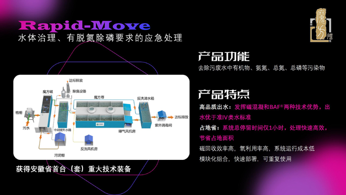 如遇同时要求脱氮除磷的提质增效或应急处理项目,可选用由魔方磁和魔方尊组合成的“Rapid-Move”系统,该系统曾获得安徽省首台(套)重大技术装备,其发挥了磁混凝和BAF两种技术优势——系统总停留时间仅1小时,占地面积省;出水水质为准四类标准;模块化组合,快速部署,可重复利用。