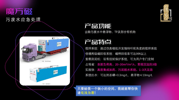 狭小空间亦可快速化浊为清——针对水体治理,以及污水处理厂、工业废水厂应急处理场景,要求快速解决污水感官问题,以及去除TP的情况下,可以选用魔方智水的魔方磁,其功能是去除SS和TP,它有车载式和集装箱式两种形式,采用磁加载混凝澄清技术,表面面负荷 20 以上、停留时间是常规沉淀技术的 1/3-1/4,占地小,处理效率高。高度集成了加药、污泥脱水以及控制系统,快速部署,快则1天,慢则3天就即可见效,处理效果立竿见影。